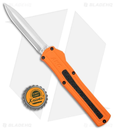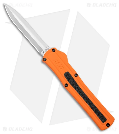 The AKC F-20 is a lightweight, mid-size OTF automatic knife from the Italian company AKC. These knives are made from aluminum with a sandpaper inlay for grip. The dual-action thumb slide has jimping for texture. The firing action is satisfying and powerful! This is a lot of knife for the price!