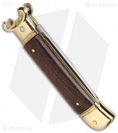 This 8″ Italian Stiletto from AKC comes in the Lever Lock Shot Puller style with a cocobolo wood handle, brass bolsters, and a flat grind blade. AKC specializes in collectible Italian stilettos made with traditional knife-making techniques. This 8″ Lever Lock model has a cocobolo handle with a sturdy stainless steel liner. Brass pins and liners add a classic finishing touch to the design. The blade comes in a dagger style with a plain edge and a polished finish. Add classic Italian style to your collection with the AKC 8″ Lever Lock stiletto.